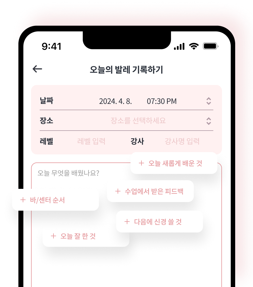 취발러가 만든 발레일기 앱, 오늘의 발레! 1. 발레 수업 기록, 한곳에 모아쓰기 당신의 발레 기록, 혹시 핸드폰 메모장이나 메신저 등 일상 기록들과 섞여있지 않나요? 이제는 오늘의 발레에 하